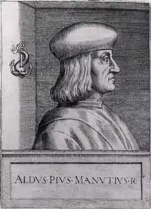 L’avènement de l’imprimerie et en particulier l’introduction de caractères grecs jouèrent un grand rôle dans la propagation des œuvres grecques antiques originales au cours de la Renaissance. Aussi, doit-on terminer en disant un mot d’Aldo Manuzio (1449-1515) qui ouvrit son imprimerie en 1494 à Venise. Le choix de cette ville fut dicté non seulement par la stabilité politique de la Sérénissime, l’importance numérique de la communauté grecque qui y était installée, mais aussi par le nombre de textes en grec que l’on trouvait à la bibliothèque de Saint-Marc[93]. Le premier ouvrage d’envergure à être imprimé fut la grammaire grecque de Constantin Lascaris en 1495 qui fut suivie par une édition en cinq volumes de l’œuvre d’Aristote entre et . L’impression en grec était difficile en raison des accents et esprits nécessaires à la compréhension du texte. Au cours de sa carrière, Manuzio utilisera pas moins de quatre fontes successives prenant comme modèles les écritures d'érudits grecs réfugiés. S’adressant à ceux-ci pour la préparation de ses textes, il publiera de nombreuses œuvres d’Aristote, des œuvres théâtrales d’Aristophane et de Sophocle, ainsi que des grammaires et autres textes pour l’étude de la langue. Ces érudits et Aldo lui-même formeront la Nouvelle Académie, club social dont la principale occupation était de recommander « les auteurs grecs susceptibles d’être imprimés et de trouver des solutions aux problèmes philologiques et littéraires qui s’y rapportaient[94]. Après sa mort, son œuvre sera continuée par son fils Paul, puis par son petit-fils Aldo le jeune[95].