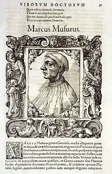 Un autre professeur de l’université de Padoue joua un rôle considérable dans la diffusion des œuvres grecques originales. Le Crétois Marcus Musurus (1470-1517), en plus d’enseigner le grec à l’université, était un collaborateur de l’imprimerie d’Aldo Manuzio. Il édita un grand nombre de premières éditions d’auteurs grecs, incluant les œuvres complètes d’Aristophane et de Platon. Ce sont également les éditions aldines qui publieront en 1495-1498 le traité « Opéra » d’Aristote en grec, laquelle donnait pour la première fois le texte grec exact d’Aristote[91].