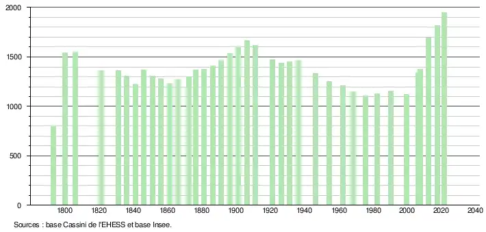 L'évolution du nombre d'habitants est connue à travers les recensements de la population effectués dans la commune depuis 1793. Pour les communes de moins de 10 000 habitants, une enquête de recensement portant sur toute la population est réalisée tous les cinq ans, les populations légales des années intermédiaires étant quant à elles estimées par interpolation ou extrapolation[22]. Pour la commune, le premier recensement exhaustif entrant dans le cadre du nouveau dispositif a été réalisé en 2007[23].