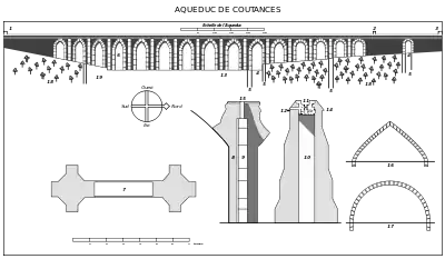 Robert Cenalis, évêque d'Avranches décrit l'aqueduc dans le livre Gallia historica : « Après un segment souterrain, l'aqueduc sort de terre, la partie aérienne mesure 240 mètres, elle-même divisée en trois. Un premier tronçon court sur un mur, le second composé de seize arcades franchit la vallée du Bruisard avant de repartir sur un mur »[3]. Cinq de ces arches sont de plein cintre, les onze autres en tiers-point.
