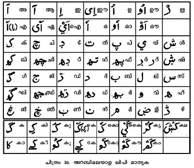 Les lettres arabi malayalam avec leurs lettres malayalam correspondantes.
