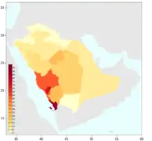 Relativement peu peuplées, la plupart des terres varient entre désert et zone semi-aride, occupées par une traditionnelle population bédouine. La végétation s'y limite à de maigres plantes et autres herbes. Moins de 2 % des terres sont cultivables, soit tout de même 20 000 kilomètres carrés, surtout dans l'Asir, et la région haute de Najran. Le centre de population est principalement situé le long des côtes est et ouest, malgré quelques oasis densément peuplées à l'intérieur du pays, telles Al-Hufuf et Buraydah. Le reste du pays compte très peu d'habitants bien que l'industrie pétrolière y ait bâti quelques communautés artificielles. L'Arabie saoudite n'a aucun lac de surface ou rivière permanente[12],[13], bien que sa grande ligne côtière s'étende sur 2 640 km de la mer Rouge au golfe Persique, offrant de nombreux récifs de coraux et une large biodiversité côtière et aquatique.