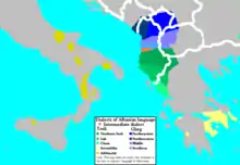 villages de Cervicati (Çervikati), Civita (Çifti), Eianina (Ejanina) hameau de Frascineto, Falconara Albanese (Fullkunara), Farneta (Farneta), Firmo (Ferma), Acquaformosa (Firmoza), Frascineto (Frasnita), Cavallerizzo (Kajverici), Castroregio (Kastërnexhi), Marri (Allimarri), San Giorgio Albanese (Mbuzati), Mongrassano (Mungrasana), Santa Caterina Albanese (Picilia), Plataci (Pllatani), Cerzeto (Qana), Spezzano Albanese (Spixana), San Benedetto Ullano (Shën Benedhiti), San Giacomo di Cerzeto (Shën Japku) hameau de Cerzeto, San Demetrio Corone (Shën Mitri) et son hameau Macchia Albanese (Maqi), San Martino di Finita (Shën Murtiri), Santa Sofia d'Epiro (Shën Sdeia), San Basile (Shën Vasili), San Cosmo Albanese Strighari, Lungro (Ungir, où se situe la cathédrale Saint-Nicolas-de-Mira (San Nicola di Mira)), Vaccarizzo Albanese (Vakarici), San Lorenzo D. Vallo, San Marco Argentano ;