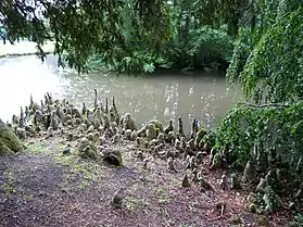 Avant la passerelle blanche, endroit préféré d’Aglaë, le cyprès chauve de la Louisiane planté avant 1822 est l’arbre le plus spectaculaire de l’Arboretum : il est dédié à l’amitié comme en témoigne la plaque d’origine apposée sur le tronc. Au pied de ce géant de 45 m de haut, deuxième arbre du parc par ses dimensions, émergent de nombreux pneumatophores, véritable réserves aériennes pour les racines installées dans les sols inondés.