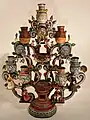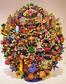 Arbre de vie. Sculpture d'Alfonso Castillo qui représente l'histoire du mole (sauce, plat traditionnel) et de la céramique Talavera de Puebla, exposé au Museo de Arte Popular (Musée d'Art Populaire) de Mexico. Les arbres de vie sont principalement fabriqués dans trois villes : Metepec dans l'État du Mexique, et Izúcar de Matamoros et Acatlán, dans l'État de Puebla. Alors qu'ils étaient autrefois destinés à des activités religieuses et représentaient un cadeau traditionnel pour les jeunes mariés comme « symbole de fertilité et d'abondance », actuellement la plupart sont élaborés à des fins commerciales[15].