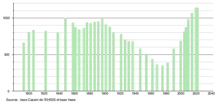 L'évolution du nombre d'habitants est connue à travers les recensements de la population effectués dans la commune depuis 1793. Pour les communes de moins de 10 000 habitants, une enquête de recensement portant sur toute la population est réalisée tous les cinq ans, les populations légales des années intermédiaires étant quant à elles estimées par interpolation ou extrapolation[8]. Pour la commune, le premier recensement exhaustif entrant dans le cadre du nouveau dispositif a été réalisé en 2004[9].