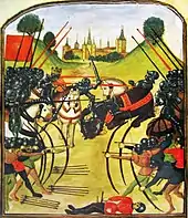 Au Bas Moyen Âge, et jusqu’au XIVe siècle, les chevaliers sont les maîtres incontestés des champs de bataille : grâce aux étriers et aux selles profondes, ils chargent lance à l’horizontale, ce qui leur confère avec l’inertie de leur destrier une puissance dévastatrice considérable[64],[65]. Dans la société médiévale, la noblesse doit conjuguer richesse et pouvoir avec bravoure sur le champ de bataille ; vivant du labeur paysan, le maître se doit de manifester sa largesse en entretenant la masse de ses dépendants[66]. L’Église a œuvré pour canaliser les chevaliers-brigands dès la fin du Xe siècle. À partir du concile de Charroux en 989, les hommes en armes sont priés de mettre leur puissance au service des pauvres et de l’Église et deviennent des milites Christi (Soldats du Christ)[67]. Depuis le XIIIe siècle, le roi de France avait pu faire admettre l’idée que son pouvoir de droit divin lui permettait de créer des nobles[68]. La noblesse se différencie donc du reste de la population par son sens de l’honneur et doit faire montre d’esprit chevaleresque, protéger le peuple et rendre justice en préservant un certain confort matériel. Elle doit justifier son statut social sur le champ de bataille : l’adversaire doit être vaincu face à face dans un corps à corps héroïque. Cette volonté de briller sur les champs de bataille est accrue par l’habitude de l’époque de faire des prisonniers et de monnayer leur libération contre rançon. La guerre devient donc très lucrative pour les bons combattants et les risques d’être tués sont donc amoindris pour les autres[69]. C’est pour cela que, lors des batailles de Bannockburn, de Crécy, de Poitiers ou d’Azincourt, la chevalerie charge d’une manière si irrationnelle selon le jugement contemporain[70].