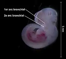 Il existe six paires d'arcs branchiaux numérotés de 1 à 6. Chez l'humain, la cinquième paire d'arcs a une existence transitoire au cours du développement et n'est à l'origine d'aucune structure définitive.