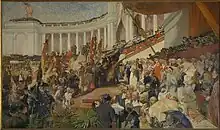 En 1904, Bordiau étant mort, le roi fait appel à l'architecte français Charles Girault[3] qui modifie les plans, dessinant un monumental arc de triomphe à trois arches. Il ne faudra que huit mois à 450 ouvriers se relayant jour et nuit pour le construire. Le projet de Girault nécessite la démolition à la dynamite des soubassements de l'arche de Bordiau et de quelques travées de la colonnade. Le hall métallique est en partie démonté derrière les arcades, dégageant une vaste esplanade.