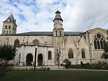 La collégiale construite au xie siècle se voit complétée au siècle suivant par un clocher-porche roman, qui a pu constituer une tour isolée à l'origine. Par ailleurs, l'intégralité de l'église est reconstruite à partir de 1200, en commençant par le chevet puis la nef qui sera voûtée d'ogives. Un clocher supplémentaire sera par ailleurs construit, tandis que le portail sud est repris en incluant la statuaire gothique dans un ensemble de trois travées dont seule la centrale est dotée d'une ouverture. Le porche qui le surplombe sera quant à lui construit à la Renaissance dans un style classicisant. De nouvelles chapelles seront construites entre la fin du Moyen âge et la Renaissance. Quant à la façade occidentale, elle fut reconstruite en 1829 dans un style néo-roman par l'architecte Poitevin[5] ; les cloîtres originellement situés au nord de l'édifice n'ont laissé que des traces.