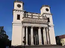 La primatiale d'Esztergom constitue la cathédrale néoclassique la plus aboutie en Hongrie, elle fut projetée dès les années 1760, confiée alors à Isidor Canevale, mais le projet ne débutera réellement qu'à partir des années 1820. Le projet, comprenant la cathédrale ainsi qu'un ensemble de bâtiments capitulaires, est confié aux architectes Ludwig von Remy et Paul Kühnel. Ceux-ci s'inspirent de l'Escurial et de l'organisation du Vatican, l'ensemble doit en effet rassembler une cathédrale, les habitations des chanoines, un palais épiscopal et un séminaire. Johan Packh révise les plans de Kühnel à partir de 1824 et Joseph Hild l'assiste pour mener à bien ce projet une nouvelle fois révisé et achevé en 1845. De plan basilical, la cathédrale est dominée par sa coupole haute de plus de 70 mètres reposant sur un édifice monoptère monumental (comprenant 24 colonnes)[1].