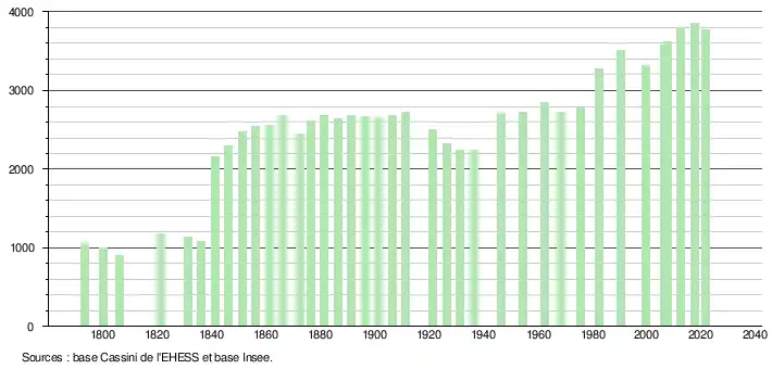- Population municipale légale en vigueur au 1er janvier 2024, millésimée 2021, définie dans les limites territoriales en vigueur au 1er janvier 2023, date de référence statistique : 1er janvier 2021.
