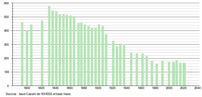 | L'évolution du nombre d'habitants est connue à travers les recensements de la population effectués dans la commune depuis 1793. Pour les communes de moins de 10 000 habitants, une enquête de recensement portant sur toute la population est réalisée tous les cinq ans, les populations légales des années intermédiaires étant quant à elles estimées par interpolation ou extrapolation[21]. Pour la commune, le premier recensement exhaustif entrant dans le cadre du nouveau dispositif a été réalisé en 2005[22]. En 2021, la commune comptait 164 habitants[Note 2], en diminution de 1,2 % par rapport à 2015 (Landes : +4,9 %, France hors Mayotte : +1,84 %). |