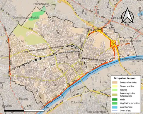 Les grands collectifs et grands ensembles se concentrent à l'ouest pour l'essentiel (Val d'Argent) et dans une moindre mesure à l'est (Orgemont). En plus des parcs urbains, les principaux espaces verts ou non construits sont situés sur les buttes du Parisis, au nord et à l'est, et occupent une surface totale de 442 hectares soit 25 % de la surface communale. Argenteuil est également détentrice du panneau « ville fleurie » et possède trois fleurs. Il faut noter enfin que 189 hectares, soit 12,4 % du territoire, sont utilisés pour les voies de communication, en particulier l'importante gare de triage ferroviaire[40].
