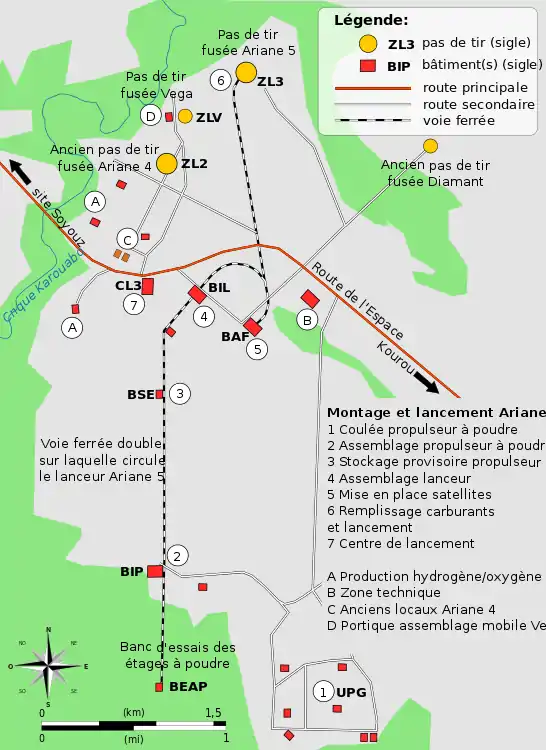 Les industriels chargés de la construction d'Ariane 5 sont principalement le groupe aérospatial européen Airbus et le motoriste français Safran. Le lanceur comprend un premier étage cryogénique (EPC) propulsé par un moteur-fusée à ergols liquides Vulcain brûlant des ergols cryogéniques flanqué de deux propulseurs à propergol solide (EAP) qui fournissent 92 % de la poussée au décollage. Selon la version, le deuxième étage est propulsé soit par un moteur-fusée Aestus brûlant des ergols stockables soit par un propulseur à ergols cryogéniques HM-7B. Comme les précédentes fusées Ariane, Ariane 5 est lancée depuis le Centre spatial guyanais (CSG) à Kourou en Guyane .