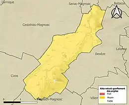 Le retrait-gonflement des sols argileux est susceptible d'engendrer des dommages importants aux bâtiments en cas d’alternance de périodes de sécheresse et de pluie. 99,8 % de la superficie communale est en aléa moyen ou fort (44,5 % au niveau départemental et 48,5 % au niveau national). Sur les 38 bâtiments dénombrés sur la commune en 2019, 38 sont en aléa moyen ou fort, soit 100 %, à comparer aux 75 % au niveau départemental et 54 % au niveau national. Une cartographie de l'exposition du territoire national au retrait gonflement des sols argileux est disponible sur le site du BRGM[29],[Carte 2].