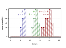 Pour calculer le degré d'appartenance de 18 à l'ensemble flou , il est nécessaire de construire tous les couples de valeurs tels que , et où . En effet, cinq couples voient leur somme égale à 18 et tous peuvent donc être à l'origine de ce résultat. De manière logique, on peut donc écrire :
