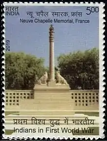 Timbre indien de 2019 représentant le monument aux morts de l'Armée de l'Inde à Neuve-Chapelle en souvenir de la bataille éponyme de mars 1915.