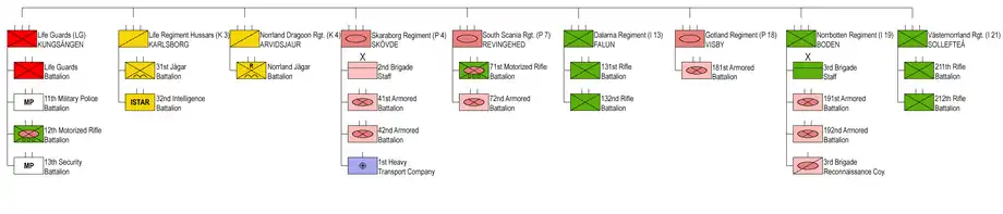 - Compagnie d'état-major et de soutien, deux compagnies de chars Stridsvagn 122, deux compagnies mécanisées CV90, compagnie de logistique