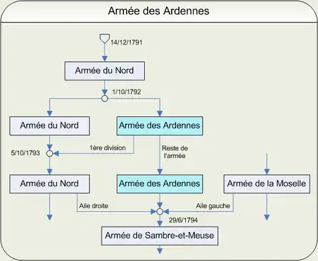 L'armée des Ardennes a été créée officiellement en à partir de l'aile droite de l'armée du Nord, commandée de juillet à par La Fayette. C'est le général Dumouriez qui employa abusivement, pendant les mois de juillet, août et septembre, le nom d'armée des Ardennes pour désigner la droite de l'armée du Nord, campée sous Sedan, et celui d'armée du Nord pour parler de la gauche de cette armée.