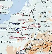 Bernadotte hésite longuement à participer à l'invasion de la France. À la conférence de Trachenberg, il avait affirmé son attachement aux frontières naturelles de la France, incluant la Belgique et la rive gauche du Rhin, acquises par la République, au contraire des conquêtes de Napoléon[51]. Autre motif qu'il confie à Louis-Victor-Léon de Rochechouart, émigré français devenu officier de liaison du tsar : « Outre la répugnance bien naturelle que j'ai à verser le sang français, j'ai une réputation à soutenir. Je ne m'abuse pas : mon sort tient à une bataille ; si je la perds, je demanderai un écu de six francs à l'Europe, personne ne me le prêterait[52] ».
