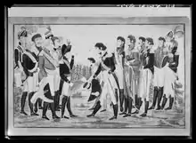 Les combats en Belgique prennent fin quand les belligérants apprennent l'issue de la bataille de Paris et l'abdication de Napoléon, définitive le , qui met fin aux opérations. Un armistice est conclu en Belgique le 12 avril, laissant aux Français la possession des places qu'ils occupent. La ligne de démarcation, suit le cours de la Sambre de Landrecies à Maubeuge, puis la frontière du département du Nord jusqu'à Menin, la route de Menin à Thourout, et atteint la mer du Nord entre Ostende et Blankenberge[63]. Le 4 mai, la garnison française évacue Anvers, laissant le port et la flotte aux Britanniques de Graham.