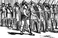 - Les Compagnons à pied (ou pezhétaires) qui forment la phalange de porteurs de sarisses[9] ;