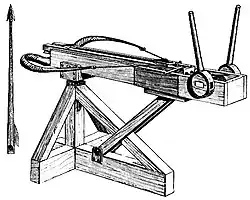 - Le gastraphète (« ventre tireur »), une arbalète primitive, envoie des carreaux à plus de 100 mètres avec une grande précision : un tireur situé à 30 mètres des remparts est sûr de faire mouche sur un défenseur qui se profilerait entre les créneaux.