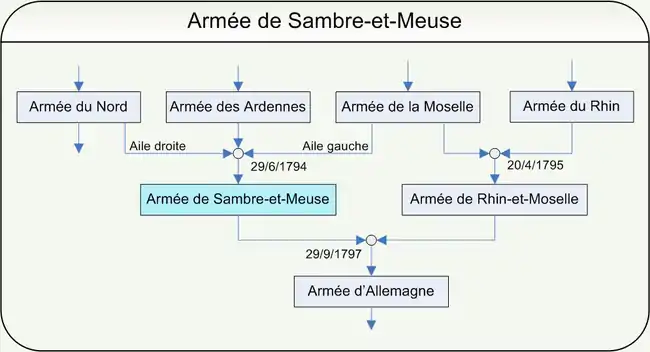 Par arrêté du Directoire en date du (8 vendémiaire an VI), mis à exécution du 7 au , les armées de Sambre-et-Meuse et de Rhin-et-Moselle sont réunies en une seule sous la dénomination d'armée d'Allemagne.