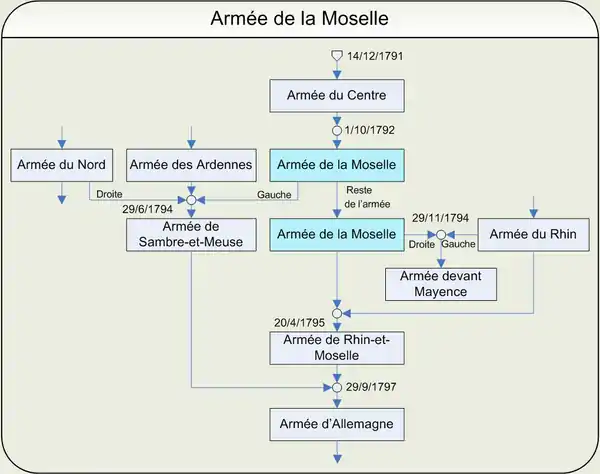 - Par décret de la Convention du (11 messidor an II), la gauche de cette armée forme avec l'armée des Ardennes et la droite de l'armée du Nord l'armée de Sambre-et-Meuse. La droite, restée aux ordres du général Moreaux, constitue à elle seule l'armée de la Moselle