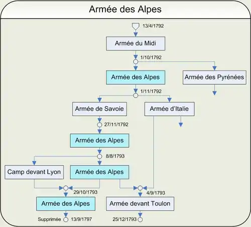 - à la suite des décrets des 27 et portant réunion de la Savoie à la République française sous le nom du département du Mont-Blanc, l'armée de Savoie reprend la dénomination d'armée des Alpes
