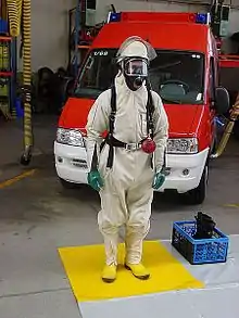 Pour ces raisons, les militaires ont développé des moyens de protection collectifs, pour véhicules et bâtiments, et individuelle sous la forme d'une combinaison étanche dite « combinaison NBC » ou « NRBC » car permettant d'évoluer dans un environnement contaminé en limitant le risque d'exposition du porteur de l'équipement. Cette combinaison dispose d'un appareil respiratoire filtrant. Dans le cadre d'une opération de sécurité civile, les pompiers en tenue de feu avec appareil respiratoire isolant (ARI), en général premiers sur les lieux avant l'arrivée de la cellule adaptée (CMIC, CMIR), peuvent effectuer une reconnaissance de courte durée pour canaliser les victimes, avant d'être relevés par du personnel en tenue NRBC[3] ; la tenue de feu est inadéquate, mais assure une protection suffisante sur une dizaine de minutes à condition de ne pas être en contact avec un matériau contaminant (liquide par exemple).