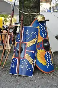 Reproduction d'armes romaines : casques, scutum et pilum.
