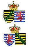 | Duché de Saxe-Iéna (1672-1690), duché de Saxe-Eisenach (1596-1638, 1640-1644 et 1662-1809), duché de Saxe-Cobourg-Eisenach (1572-1596 et 1633-1638), duché de Saxe-Weimar (1572-1809) et duché de Saxe-Wittemberg (1296-1356). | Duché de Saxe-Cobourg (1596-1633 et 1680-1735). | Duché de Saxe-Meiningen (1680-1918). |