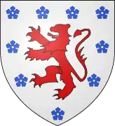 | Écu | De sable au lion rampant d'or armé et lampassé de gueules. L'écu, timbré d'un heaume d'or couronné, est posé sur une main de justice et un sceptre au lion croisés. | |