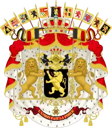 Les armoiries de la maison royale de Belgique ont été modifiées par arrêté royal du (parution au Moniteur belge ) pour refléter les « évolutions historiques et juridiques traversées depuis l'entrée en vigueur de l'arrêté royal du »[1]. La devise nationale apparaît désormais dans les trois langues : d'abord en néerlandais à gauche, puis en français au centre et en allemand à droite. Le « lion belgique » est chargé sur l'épaule d'un écusson aux armes de la Saxe. Enfin, il est prévu diverses brisures pour le Roi ou la Reine ayant abdiqué, les princes et princesses de la maison royale selon leur rang, etc.[2],[3]