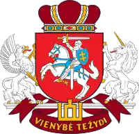 Le Parlement de la Lituanie (Seimas en lituanien) utilise une autre version des armoiries. Elles sont composées de l'écu et les supports avec le chapeau ducal sur l'écu, et une devise Vienybė težydi, qui signifie « Laissez l'unité fleurir » en lituanien. Au-dessus de la devise se trouvent les colonnes dorées de Gediminas, un autre symbole national en Lituanie. |