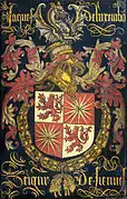 écartelé en 1 et 4 de gueules, au lion d'argent à la queue fourchée passée en sautoir, couronné, armé et lampassé d'or et en 2 et 3 burelé d'argent et d'azur de dix pièces, au lion de gueules, armé, lampassé et couronné d'or. |
