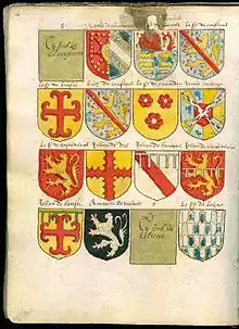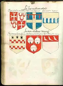 - II (fol. 28v – 35v, 49r – 52v): 191 blasons de participants à un tournoi à Mons; 1310