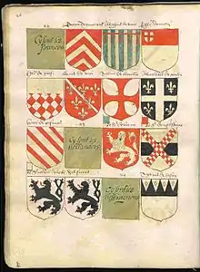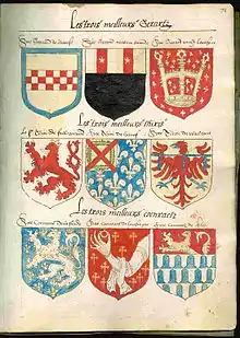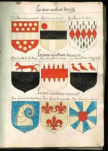 - I (fol. 1r – 8v, 18r – 28v): 337 blasons des participants à un tournoi de Compiègne, "février 1238" [mccxxxviii]: la date indiquée est probablement erronée (comme de nombreuses armoiries seraient autrement anachroniques), peut-être 1278 [mcclxxviii] est plus probable (les armoiries du roi de Sicile sont celles d'Anjou, pour Charles Ier, r. 1266-1285); le lion de Luxembourg pour «Henri de Luxembourg» serait alors en référence à Henri VI (1240-1288), père de l'empereur Henri VII.