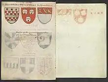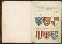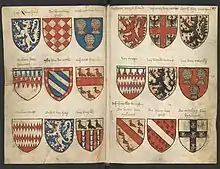 Première page ouverte (foll. 1v–2r) de l'Armorial de Bavière | |