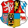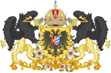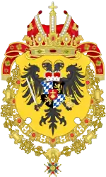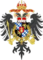 parti de un coupé de deux, au 1 de gueules, au lion d'argent à la queue fourchée passée en sautoir, couronné, armé et lampassé d'or, qui est de Bohême, au 2 d'azur, à l'aigle échiquetée d'argent et de gueules, becquée, languée, membrée et couronnée d'or, qui est de Moravie, au 3 d'or à l'aigle de sable, armé, becqué et langué de gueules, portant sur son cœur un croisant d'argent surmonté d'une croix de même, qui est de Silésie, au 4 burelé d'argent et d'azur de dix pièces, au lion de gueules, la queue fourchée passée en sautoir, armé, lampassé et couronné d'or, qui est de Luxembourg, au 5 coupé crénelé d'azur et d'or qui est de la Haute-Lusace et au 6 d'argent au bœuf de gueules issant sur une terrasse de sinople, qui est de la Basse-Lusace ; sur le tout parti de sable, au lion d'or, armé, lampassé et couronné de gueules, qui est du Palatinat et fuselé en bande d'azur et d'argent, qui est de Bavière enté en pointe de gueules à l'orbe d'or, qui est la dignité d'archi sénéchal du Saint-Empire[7]. |