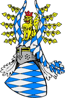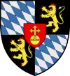 fuselé en bande d'azur et d'argent (Wittelsbach), sur-le-tout au lion d'or, armé, lampassé et couronné de gueules.