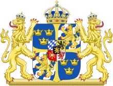 écartelé à la croix pattée d'or, qui est la Croix de Saint-Eric, cantonnée en 1 et 4, d'azur à trois couronnes d'or posées 2 et 1 qui est de Suède moderne, en 2 et 3, d'azur, à trois barres ondées d'argent, au lion couronné d'or armé et lampassé de gueules, brochant sur le tout, qui est de Suède ancien, sur le tout, écartelé en 1 fuselé en bande d'azur et d'argent (qui est de Bavière), en 2 d'or au lion de sable armé et lampassé de gueules (qui est de Juliers), en 3 de gueules, à l'écusson d'argent, aux rais d'escarboucle d'or, brochantes sur le tout (qui est de Clèves) et en 4 d'argent au lion de gueules, la queue fourchée passée en sautoir, armé, lampassé et couronné d'or (qui est de Berg), sur le tout du tout de sable, au lion d'or, armé et lampassé et couronné de gueules (qui est du comté palatin du Rhin)[13],[12].
