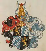 écartelé en 1 et 4 de sable, au lion d'or, armé, lampassé et couronné de gueules (Palatin) et en 2 et 3 fuselé en bande d'azur et d'argent (Bavière).[9].