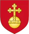 d'or, à l'aigle de sable, membrée, becquée et liée de gueules ; écartelé en 1 et 4 fuselé en bande d'azur et d'argent et en 2 et 3 de sable, au lion d'or, armé, lampassé et couronné de gueules, sur le tout de gueules à l'orbe crucifère d'or[4]. |