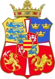Écartelé : à la croix pattée d'argent bordée de gueules, qui est le Danebrog, cantonnée en I, d'or, à neuf cœurs de gueules, posés en trois pals, à trois lions léopardés d'azur, armés et lampassés de gueules, couronnés du champ, brochant sur-le-tout (de Danemark) ; en II, de gueules, au lion couronné d'or, tenant dans ses pattes une hache danoise d'argent, emmanchée du second (de Norvège ancien) ; en III, d'azur, à trois couronnes d'or (de Suède moderne) ; en IV, d'or au lion léopardé d'azur soutenu de neuf cœurs de gueules ordonnés 5 et 4 (du Royaume des Goths) ; sur-le-tout écartelé : 1, d'or, à deux lions léopardés d'azur, armés et lampassés de gueules (de Schleswig) ; 2 de gueules, à la feuille d'ortie d'argent (de Holstein) ; 3 de gueules, au cygne d'argent, becqué, membré et colleté d'une couronne d'or (Stormarn) ; 4 d'or à deux fasces de gueules (de Oldenbourg) |