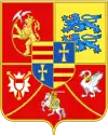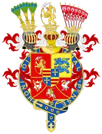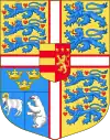 Ecartelé : aux I et IV contre-écartelé d'azur à trois fleurs-de-lys-d'azur, et de gueules aux trois léopards d'or ; au II d'or, au lion de gueules, au double trescheur fleuronné et contre-fleuronné du même ; d'azur, à la harpe d'or, cordée d'argent ; sur le tout d'or, à neuf cœurs de gueules, posés en trois pals, à trois lions léopardés d'azur, armés et lampassés de gueules, couronnés du champ, brochant sur-le-tout (de Danemark) ; un label d'argent brochant sur la partition, le deuxième lambel chargé d'une Croix de saint Georges de gueules |