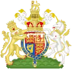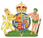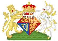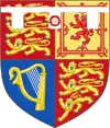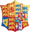 Ecartelé, en I et IV de gueules aux trois léopards d'or, en II d'or, au lion de gueules, au double trescheur fleuronné et contre-fleuronné du même et en III d'azur, à la harpe d'or, cordée d'argent, un lambel d'argent brochant sur la partition ; sur le tout, écartelé d'or et de gueules, à quatre lions de l'un à l'autre armés et lampassés d'azur, et surmonté de la couronne de Prince de Galles |