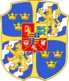 Écartelé : à la croix pattée d'or, qui est la Croix de Saint Éric, cantonnée en 1 et 4, d'azur, à trois couronnes d'or (de Suède moderne), en 2 et 3, d'azur, à trois barres ondées d'argent, au lion couronné d'or, brochant sur le tout (de Suède ancien) ; sur-le-tout écartelé : 1, de gueules, au lion couronné d'or, tenant dans ses pattes une hache danoise d'argent, emmanchée du second (de Norvège ancien) ; 2, d'or, à deux lions léopardés d'azur, armés et lampassés de gueules (de Schleswig) ; 3, de gueules, à la feuille d'ortie d'argent (de Holstein) ; 4, de gueules, au cygne d'argent, becqué, membré et colleté d'une couronne d'or (de Stormarn ; enté en pointe de gueules, au cavalier armé d'argent (de Dithmarse) ; sur-le-tout-du-tout, écartelé d'or à deux fasces de gueules (de Oldenbourg) et d'azur, à la croix pattée, au pied fiché d'or (de Delmenhorst). |